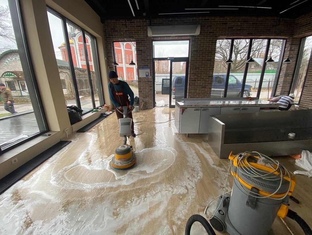 Нет. Продукция Kiehl и Buzil относится к профессиональному сегменту с легкими отдушками. После завершения работ мы проводим нейтрализацию — промываем пол чистой водой, что убирает любые остатки средств и запахов.